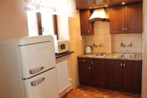 Kuchnia – kuchenka mikrofalowa, kuchnia elektryczna, okap, zlewozmywak, czajnik bezprzewodowy, duża, stylowa lodówka, narożnik kuchenny, szafki, grzejnik. Na ścianach glazura, a w przedpokoju płytki kamienne.