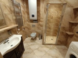 Łazienka – prysznic z baterią termostatyczną, duża kabina prysznicowa z płytek i mozaiki (120×90), duża umywalka z szafką i baterią bezdotykową, powieszane WC w zabudowie, suszarka-grzejnik na ręczniki, podgrzewana podłoga, stylowe lustro, wiele półek i wieszaków na ręczniki.