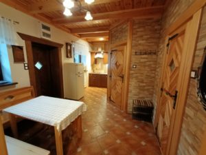 Meble, drzwi, wykończenia, sufity są z litego drewna sosnowego, co korzystnie wpływa na mikroklimat. Wysokie pomieszczenia (salon ponad 3,5m) dają poczucie przestrzeni i większego komfortu. W budynku jest też internet bezprzewodowy. Dach ma dodatkowe ocieplenie izolacją refleksyjną, co nie spowoduje nagrzewania w lecie i wychłodzenia zimą. Przed domem duży taras ze stylowej kostki brukowej (50m) oraz zadaszony stół biesiadny z podświetleniem (mini altanka).