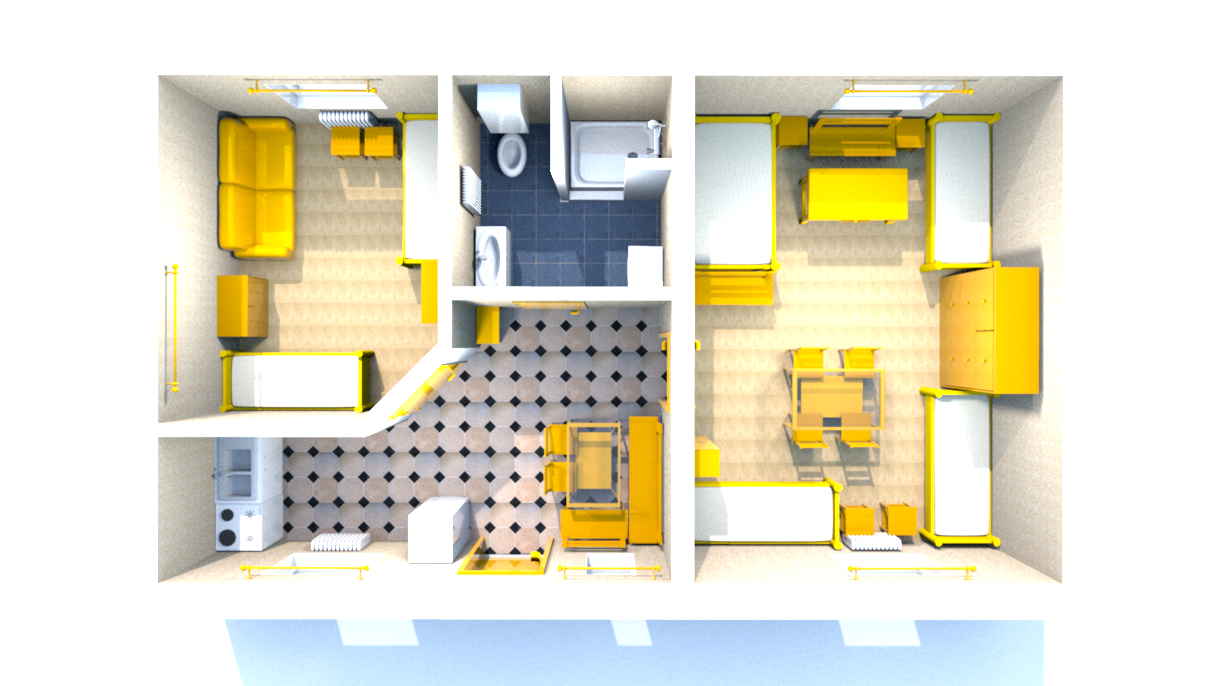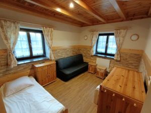 Pokój – wersalka, 2 łóżka sosnowe, TV 32″, komoda, szafa, grzejnik, ława, szafki nocne.