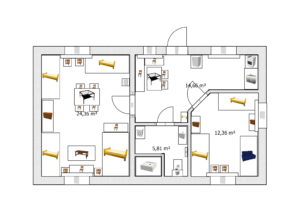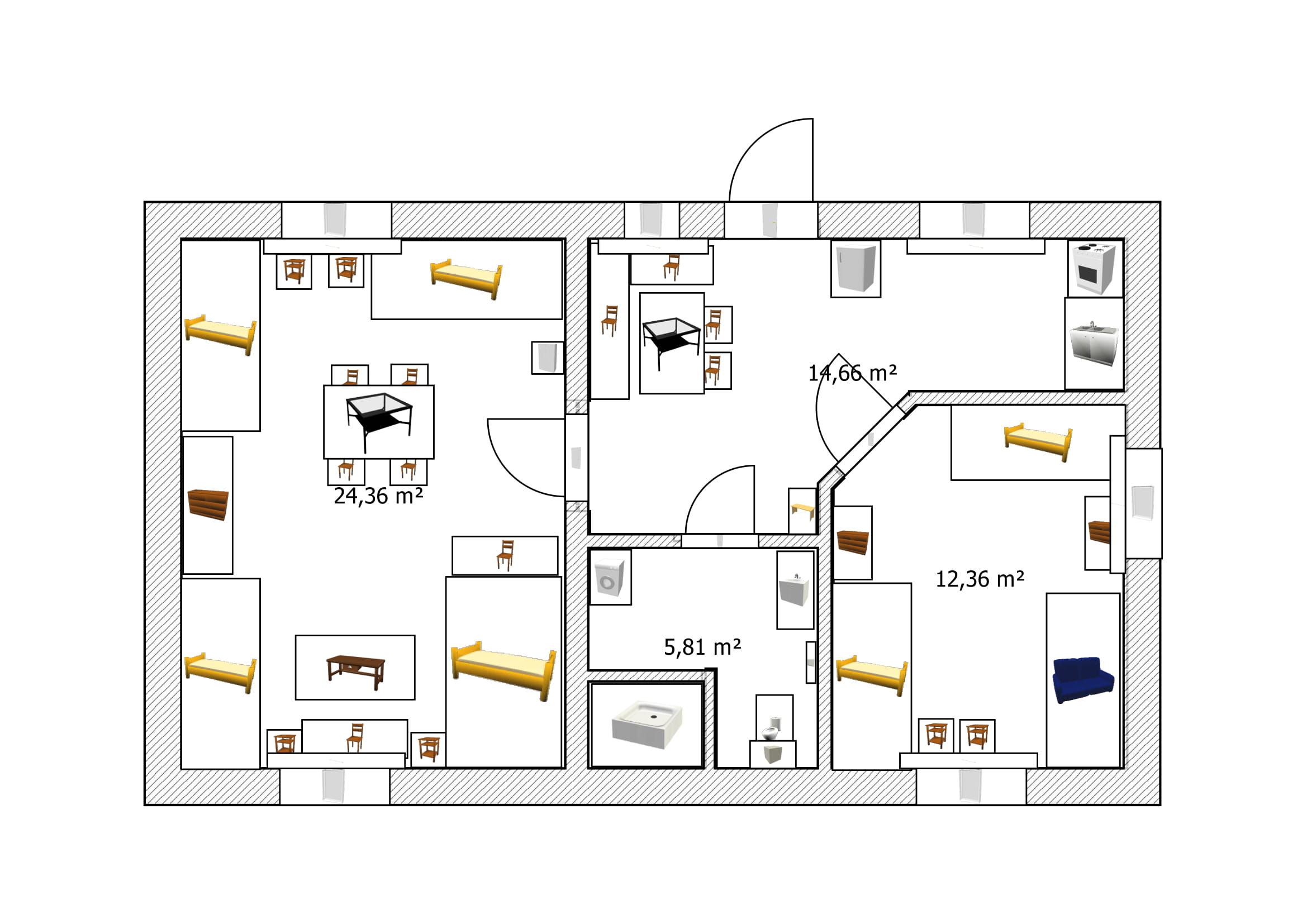 Dom wolnostojący (apartament) – całoroczny dom murowany o wysokim standardzie (60m) na dużej, ogrodzonej działce (ok 2ha). Posiada 2 pokoje (pokój 13m oraz wysoki salon 25m2), dużą łazienkę (6m2) oraz kuchnię połączoną z przedpokojem (15m2).